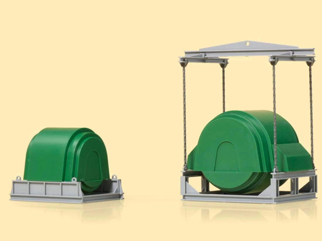 Spur H0. Als Beladegut hervorragend geeignet. Je ein großer und ein kleiner Umformer mit Transportgestell und Traverse. Maße: 52 x 38 x 43 mm, 35 x 33 x 31 mm.