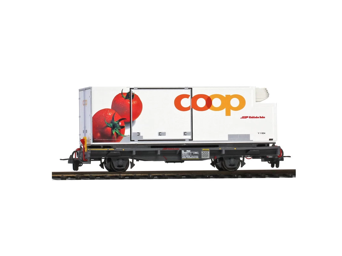 Modell: Spur H0m Gleichstrom. Neuauflage zweiachsiger Containertragwagen Lb-v beladen mit Coop-Containern der jüngsten RhB-Kühlcontainergeneration Y 11601-11608.