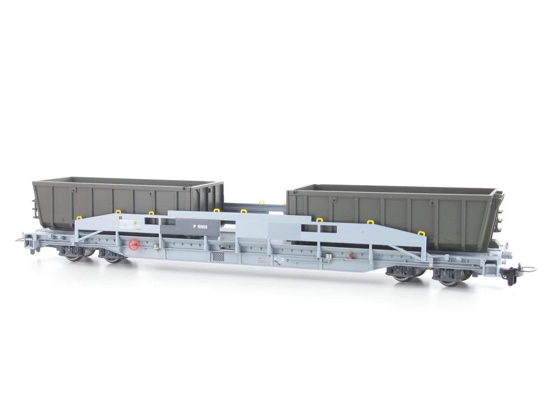 Modell: Spur H0m Gleichstrom. Tragwagen P 10050 mit zwei Schlackenmulden Gevag Untervaz. Die beiden Sl 7756+7759 wurden zu Privatwagen P 10049 bzw. P 10050 der Gevag Untervaz umgezeichnet.