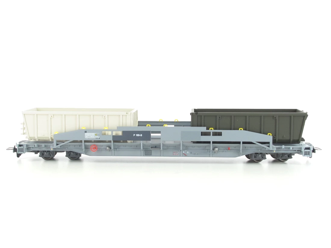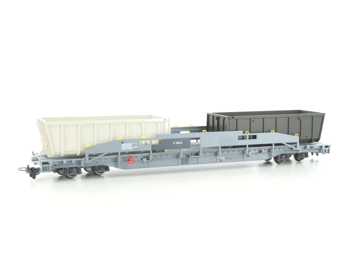 Modell: Spur H0m Gleichstrom. Tragwagen P 10049 mit zwei Schlackenmulden Gevag Untervaz. Die beiden Sl 7756+7759 wurden zu Privatwagen P 10049 bzw. P 10050 der Gevag Untervaz umgezeichnet.