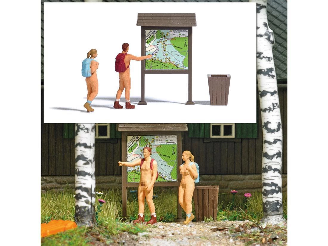 Modell: Spur H0. Action Set für die realistische Belebung Ihrer Modellwelt. Nacktes Pärchen beim Wandern, nur mit Wanderausrüstung bekleidet. Hinweistafel mit Wanderkarte und Abfallkorb enthalten.