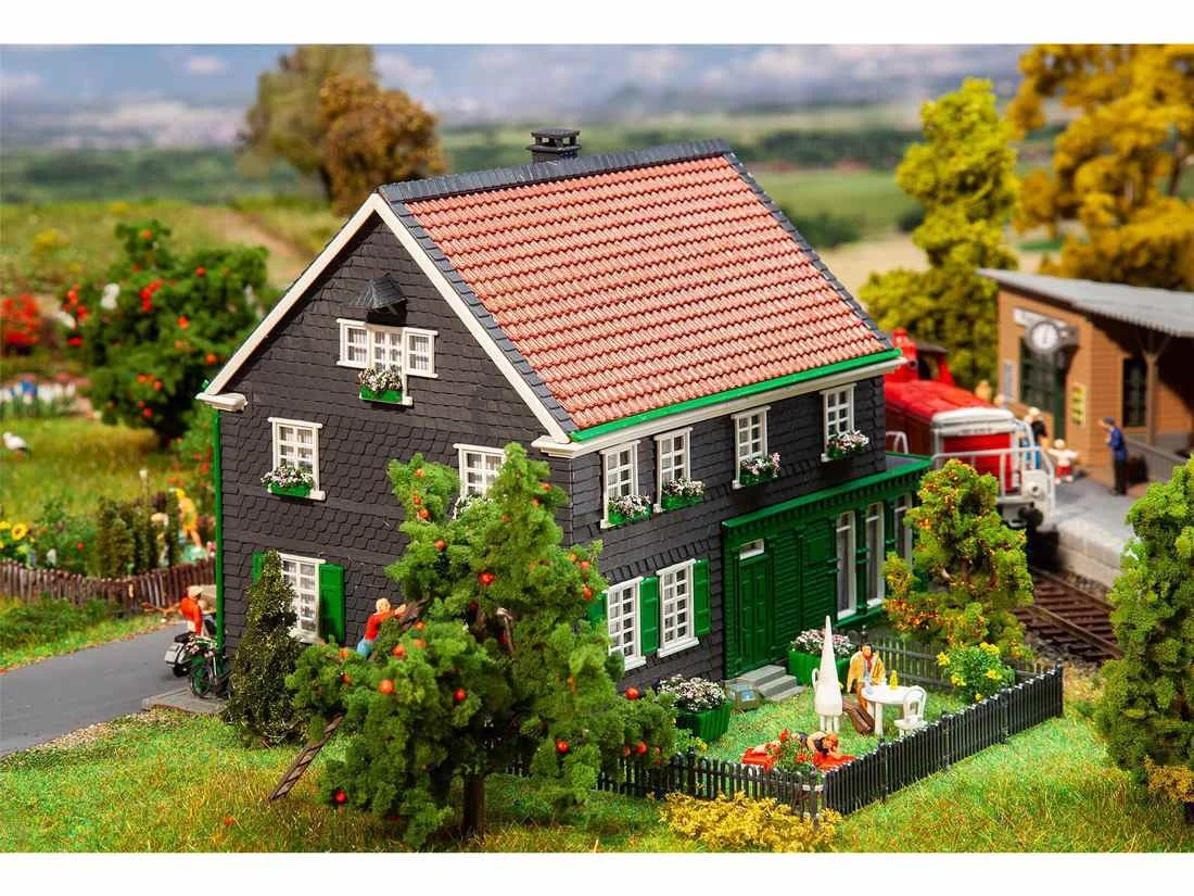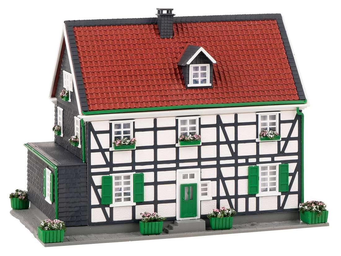 Modell: Spur H0. Zweigeschossiges Wohnhaus in Schiefer- und Fachwerkbauweise nach dem Originalvorbild des Geburtshauses von Wilhelm Conrad Röntgen, dem Entdecker der Röntgenstrahlen, in Remscheid-Lennep, Nordrhein-Westfalen. Der Bausatz enthält 112 Bauteile in 6 Farben, Fensterfolie, 1 Gardinenmaske und 1 Bauanleitung.