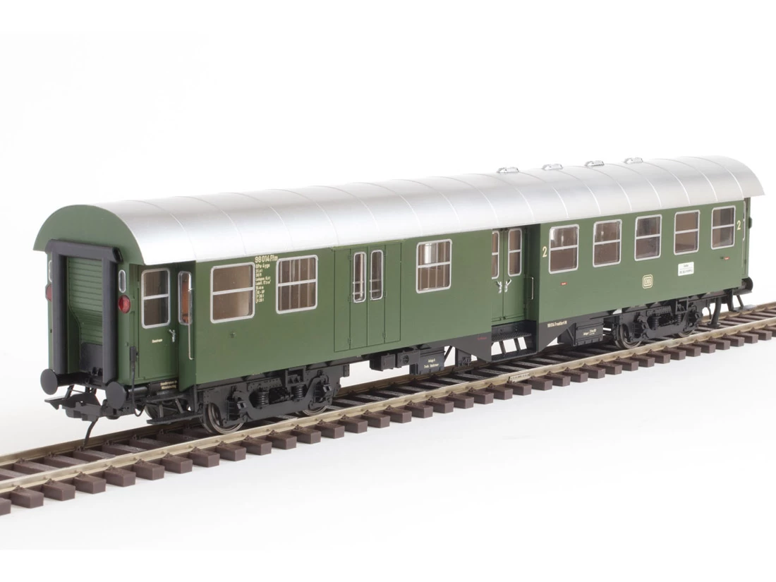 Modell: Spur 0 Gleichstrom. Ausgestattet mit Metallradsätzen, konstanter, flackerfreier Innenbeleuchtung, im Digitalbetrieb schaltbar, mit Neonröhreneffekt beim Einschalten, Stromabnahme in den Achslagern, dadurch keine Beeinflussung der Laufeigenschaften, Spurkranzhöhe kleiner 1,2mm, Inneneinrichtung, automatische Kupplung mit Kurzkupplungskulisse, Kupplungsnormschacht, Federpuffer, mit originaler Schraubenkupplung nachrüstbar.