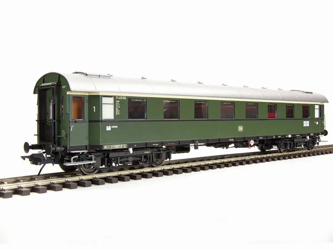 Modell: Spur 0 Gleichstrom. Schnellzugwagen Gruppe 29, 1. Klasse, A4üe-28/52 DB Epoche 3b/1960, Betriebsnummer 11 429 Köln, flaschengrün RAL 6007.