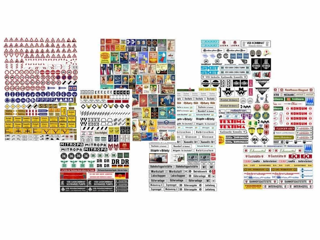 Modell: Spur TT. Sechs Bogen im Format A6 (105 x 148 mm), selbstklebend, nach Motiven entlang der Döllnitzbahn-Strecke.