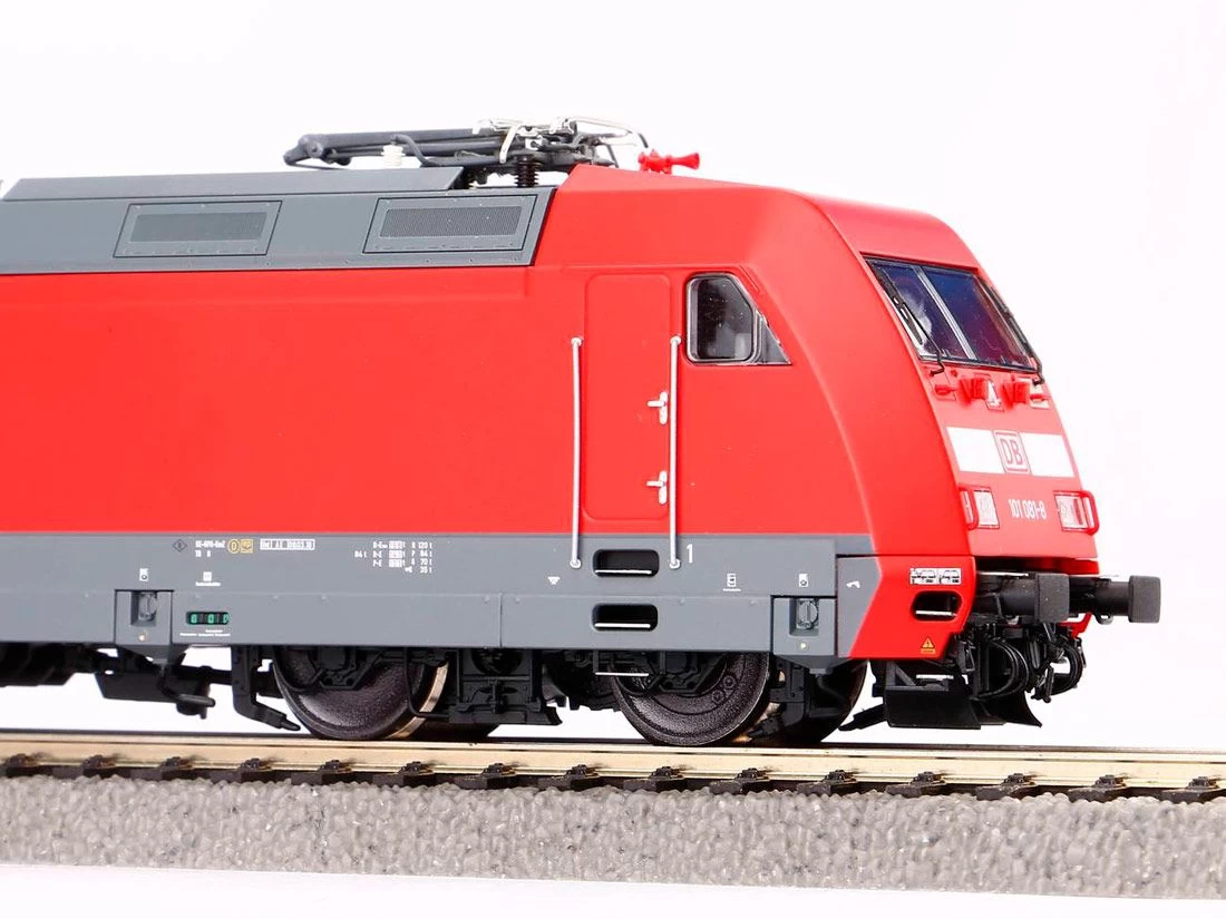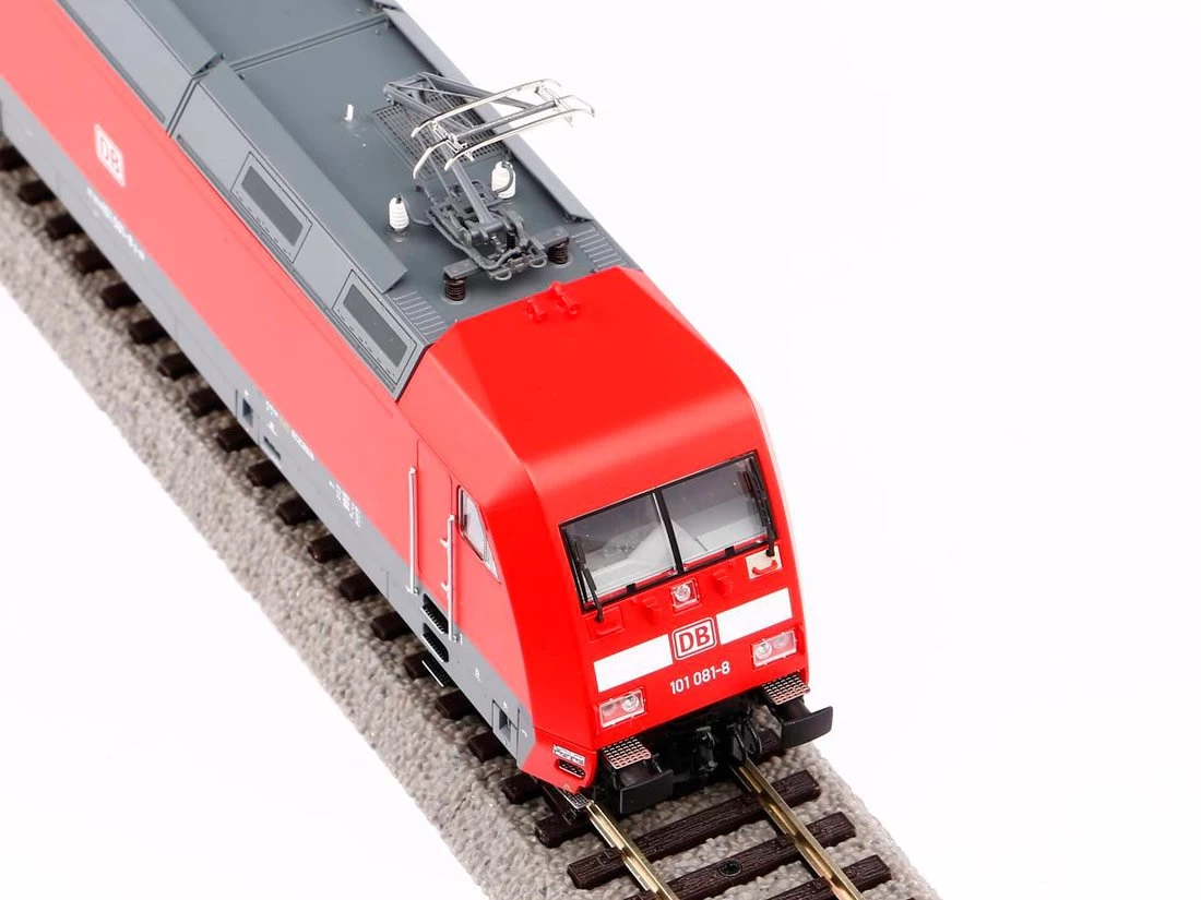 Modell: Spur H0 Gleichstrom. Nun ist auch dieser Tausendsassa der DB AG als Piko Expert Modell vertreten. Die moderne Bauform der Lokomotive ist exakt nachempfunden worden. Vorbildgerecht ist die Lok in verkehrsrot lackiert, inklusive „DB-Keks“. Die Einholm-Stromabnehmer sind filigran nachgebildet worden. Scharf gravierte Drehgestelle runden den optischen Auftritt ab. Zur Komplementierung liegen zurüstbare Bremsschläuche und Sonnenblenden bei. Für freie Fahrt sorgt ein kraftvoller, 5-poliger Motor. Mit zwei Schwungmassen ausgestattet, läuft die BR 101 mit extremer Laufruhe. Traktion beim Fortkommen verschaffen zwei diagonal angebrachte Haftreifen. Technisches Highlight sind die verbauten Führerstands- und Führerpultbeleuchtungen. Der Lichtwechsel erfolgt fahrtrichtungsabhängig in rot/weiß, natürlich ausgeführt in modernster LED-Technik. Im Digitalbetrieb sind diese Funktionen separat schaltbar. Mittels Steckschnittstelle ist die einfache Digitalisierung bereits vorbereitet.