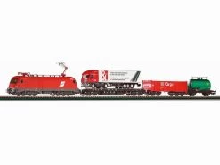 Bestehend aus: 1x E-Lok Taurus ÖBB mit 3 Güterwagen, 12 x 55412 Bogen mit Bettung R2 422 mm, 5 x 55401 Gerade Gleise mit Bettung 231 mm, 1 x 55406 Gerades Gleis für Anschluss-Clip, 1 x 55447 Sockel für Anschluss-Clip, 1 x 55270 Anschluss-Clip, 1 x Fahrregler, 1 x Netzteil (Adapter 5,4 VA).