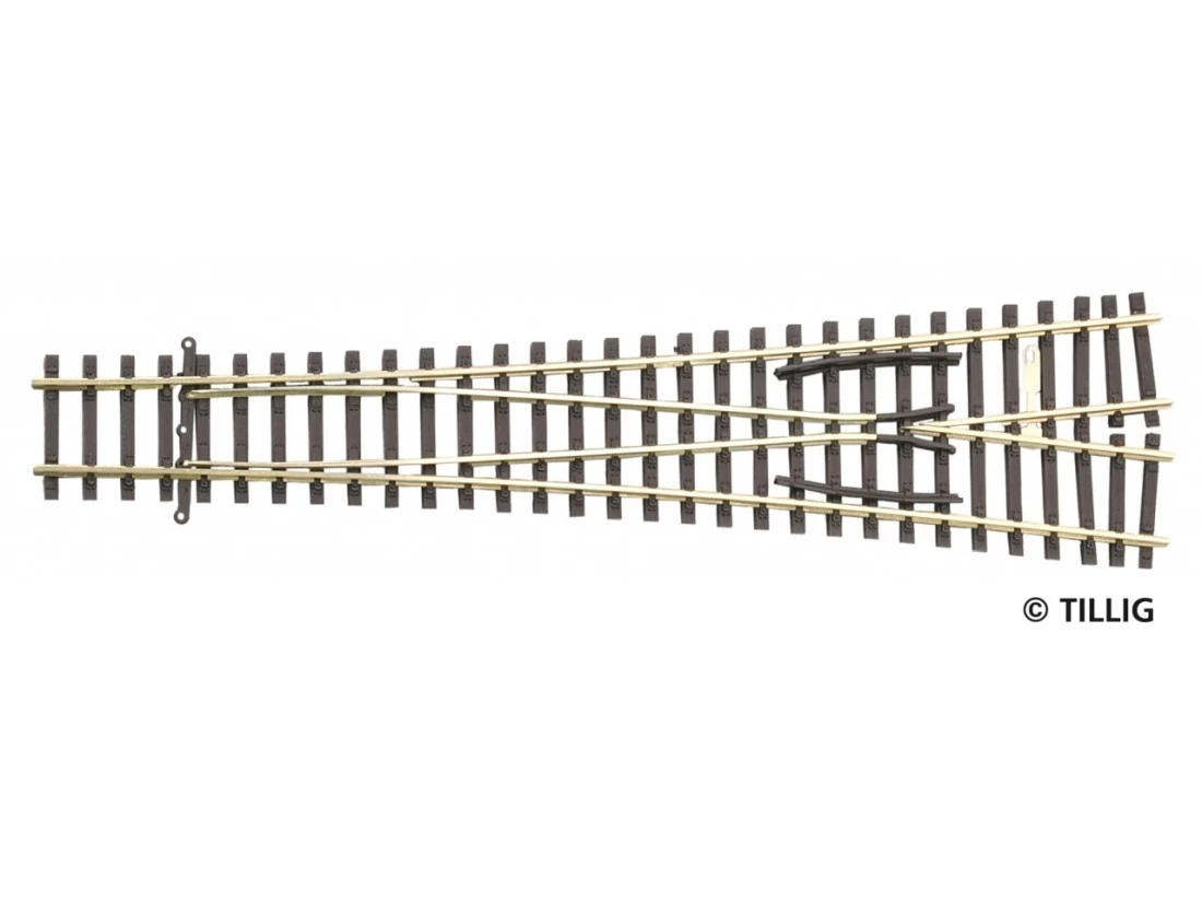Modell: Spur TT. Gleis Außenbogenweiche ABW R1986 12 Grad (2×6 Grad). Das Tillig TT-Modellgleissystem mit 2,07 mm hohen Schienenprofilen aus Neusilber hat neben blanken auch brünierte Schienenprofile. Weichen sind mit verschiedenen Herzstückwinkeln im Sortiment. Neben einfachen Weichen gibt es zahlreiche weitere Formen wie Innenbogen-, Außenbogen- und Doppelkreuzungsweichen, doppelte Gleisverbindungen und Dreiwegeweichen. Zusätzlich zu den angebotenen Gleisradien gibt es Flexgleise mit verschiedenen Schwellenarten: Holzschwelle, Stahlschwelle und Betonschwelle. Außerdem werden fast alle Gleiselemente auch als Bausatz angeboten. Ergänzt wird das Modellgleissystem durch die STYROSTONE®-Gleisbettung mit echtem Schottermaterial. Damit erhalten die Gleise auf schnelle und einfache Art ein Schotterbett, ohne dass ein aufwendiges Einschottern per Hand notwendig wird.