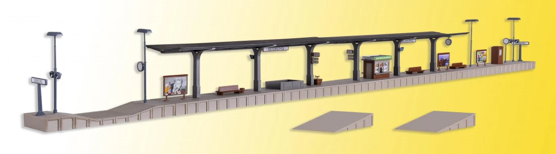 Modell: Spur H0. Bahnsteige sind ein unverzichtbares Zubehörelement im Bahn- bzw. Bahnhofsbereich. Das Modell Rheinburg Art. 43535 sowie die lange Variante Seeburg passen durch ihr zeitloses Design gleich in mehrere Epochen. Licht auf die Bahnsteige bringt der Leuchtstab Art. 46555.